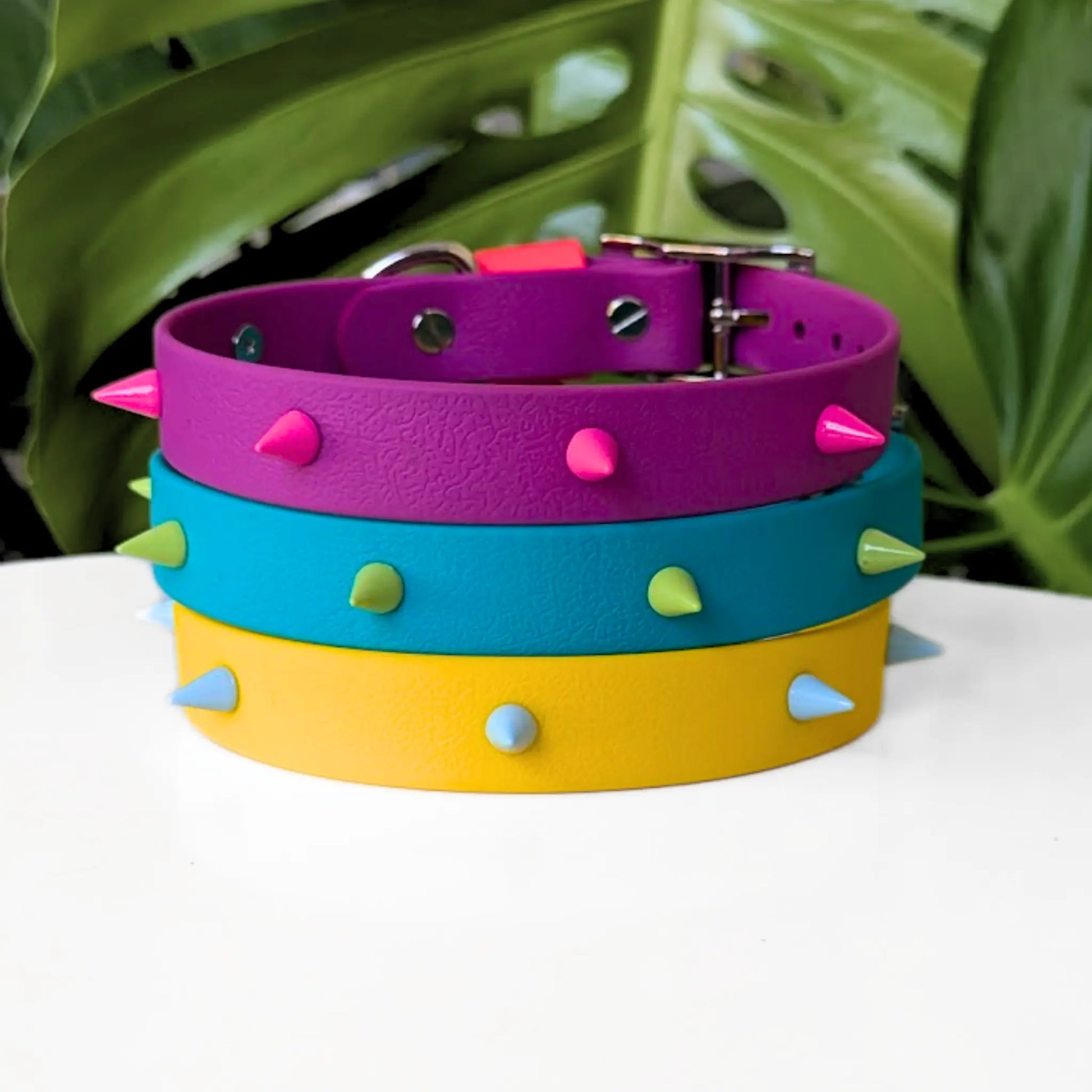 ¡Con spikes metálicos que le dan un look único y llamativo.! Fabricado en cinto PVC tipo Biotano de 20 mm de ancho.